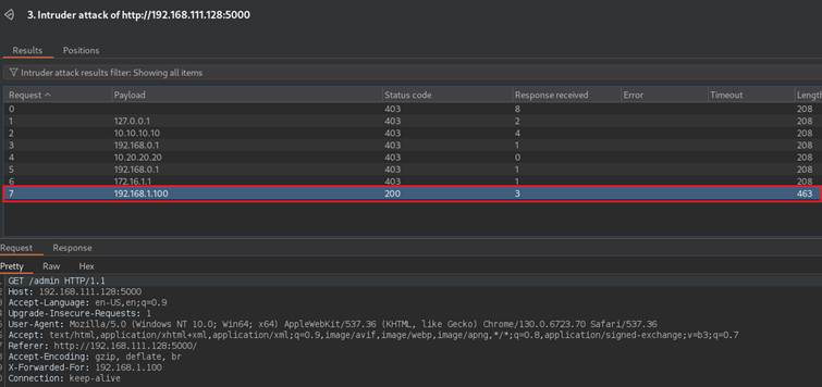 Often server will not reveal to us that it honors some headers – sometimes it does, returning various error. This time, server does not return any information if any injected header is working. Let’s again assume, that attacker is persistent and is trying all types of headers and basic IP addresses, either from public wordlists or custom built. After injecting various IP addresses in X-Forwarded-For, it is revealed that one of the addresses responded with different length: